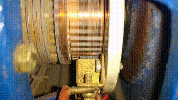 換向器由兩個半圓段構成,連接處由絕緣材料隔開,兩段換向器轉動分別與碳刷連接,碳刷會重復連接到符合推動力的那段換向器,這樣重復電機就轉動起來了。